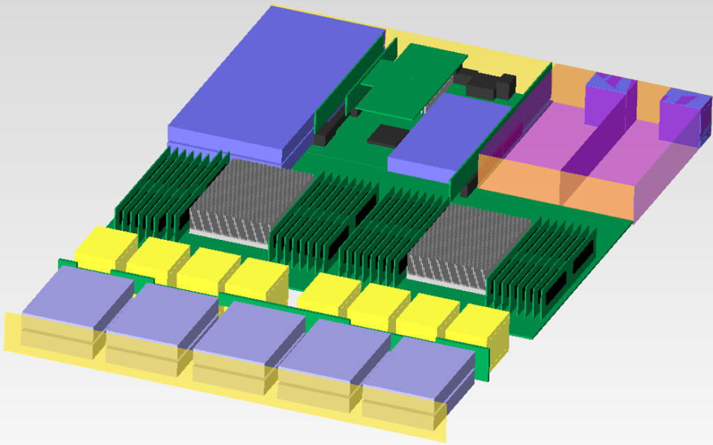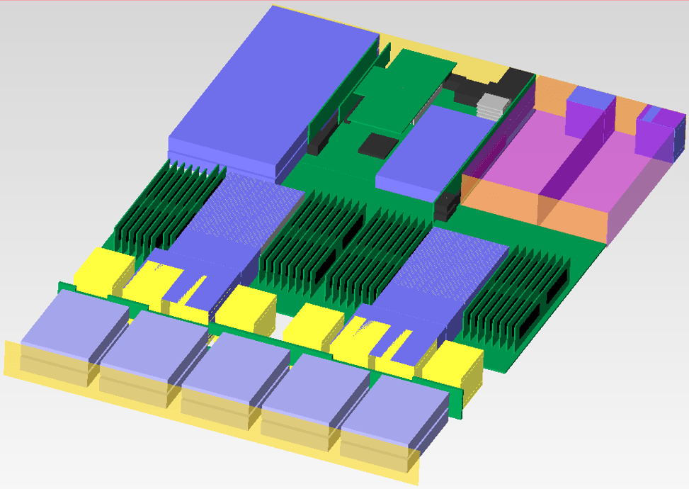 原有的1U 系統模型當中,安裝了中間兩張按照原有電路模型所建立的板卡以及左側兩張未知長卡的示意模型。之所以作出這測試主要的原因是,常常,我們並不知道客戶或是使用者會如何惡搞機器,以至於怎麼說好像都有爭議。