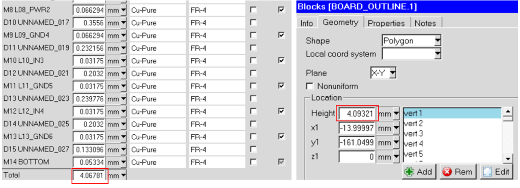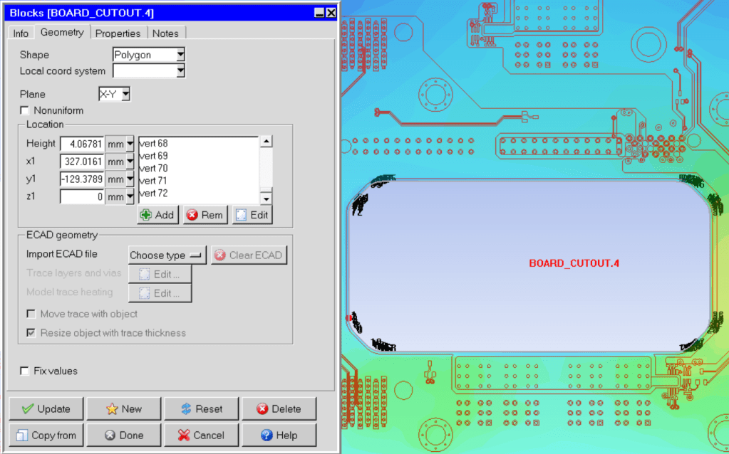 而如果使用PCB module載入線路,搭配import進來的風孔,需要注意的地方是,兩者厚度會不一樣,差別是在於PCB module建立的是不含上下綠漆的厚度,而透過import進來的就是board file裡面的設計厚度,兩者會差一點點,需要調整,不然在後面切網格會遇到極大麻煩。