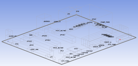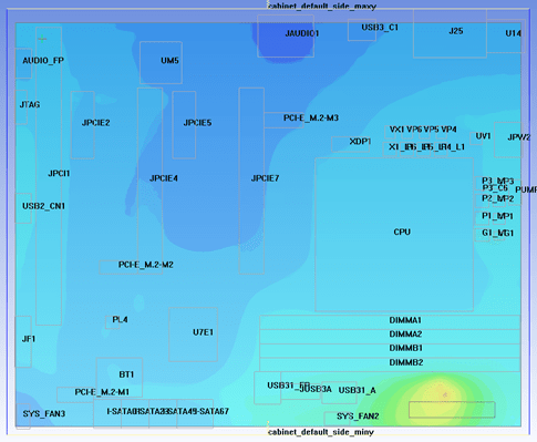 因為整張PCB很像一塊平地,而周遭許多的像是DIMM或是CPU帶heatsink,或是SAS connector之類的東西就很像地形對那個小紅發熱點造成影響。